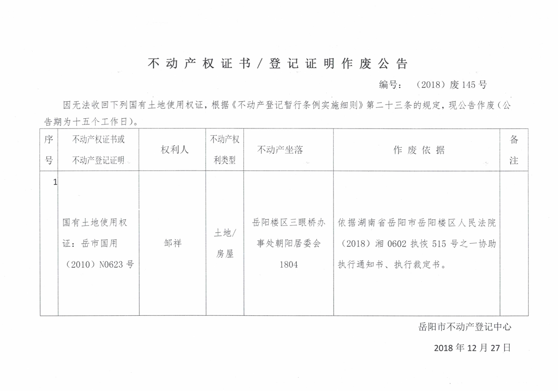 不动产权证书、登记证明作废公告 编号:(2018)废145号