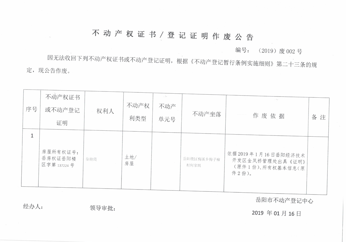 不动产权证书、登记证明作废公告 编号:(2019)废002号