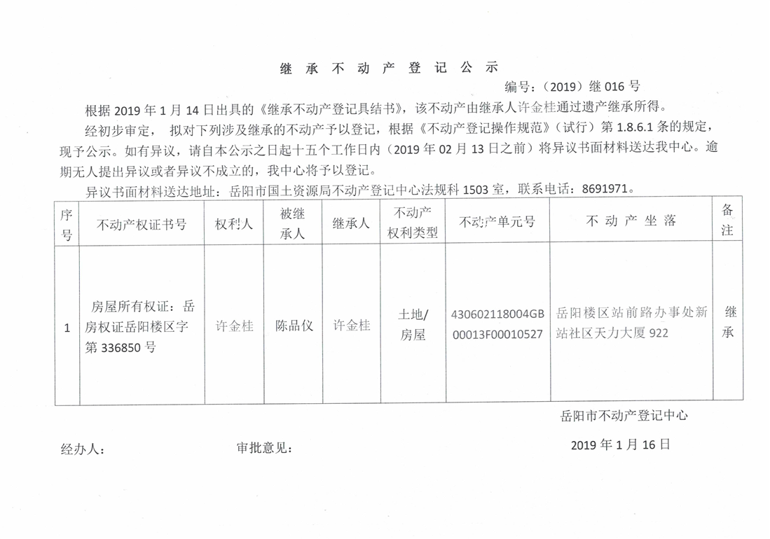 继承不动产登记公示 编号:(2019)继号016号