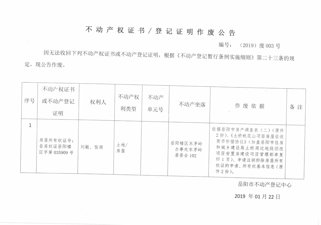 不动产权证书、登记证明作废公告 编号:(2019)废003号