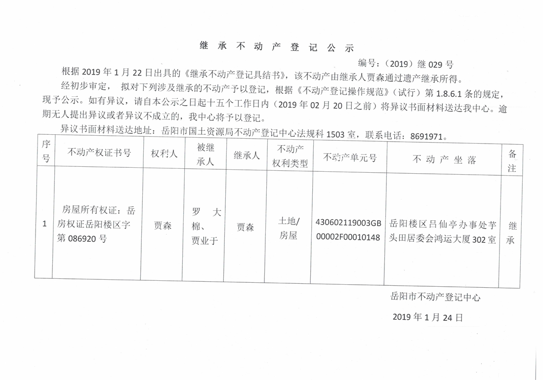 继承不动产登记公示 编号:(2019)继号029号