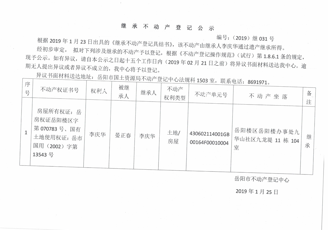 继承不动产登记公示 编号:(2019)继号031号