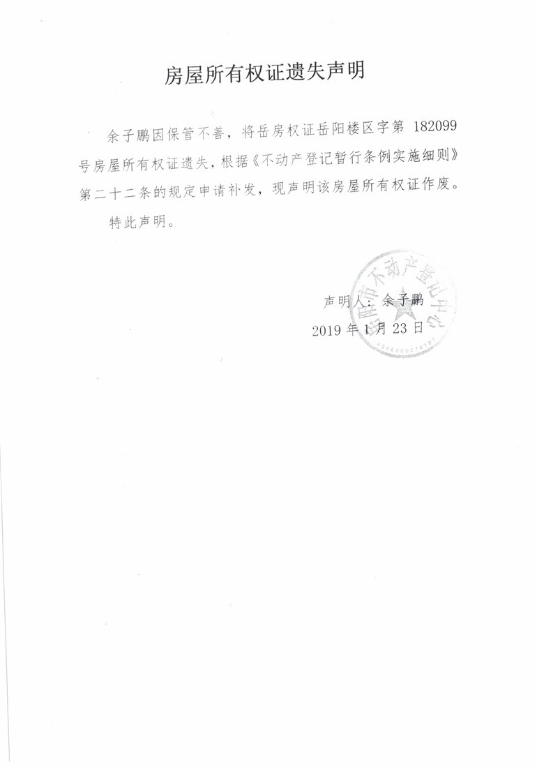 房屋所有权证遗失声明(余子鹏)