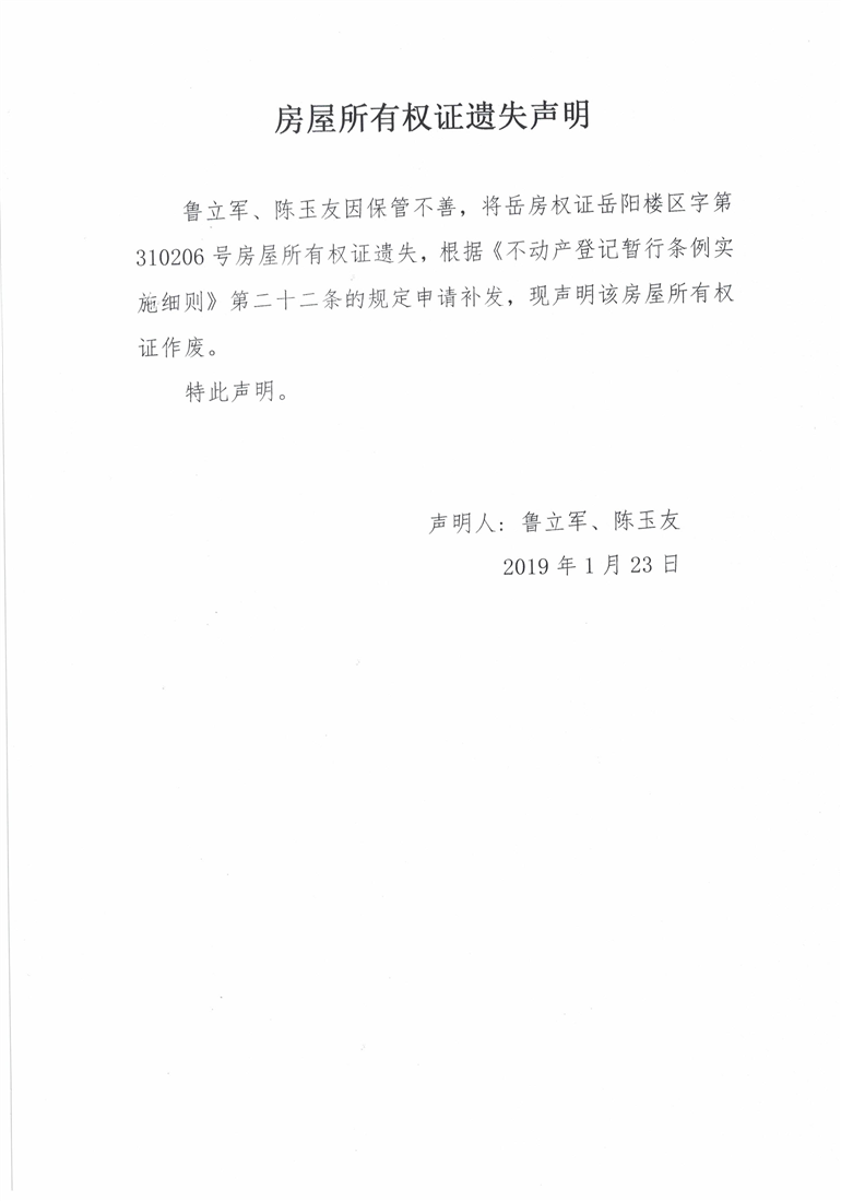 房屋所有权证遗失声明(鲁立军、陈玉友)