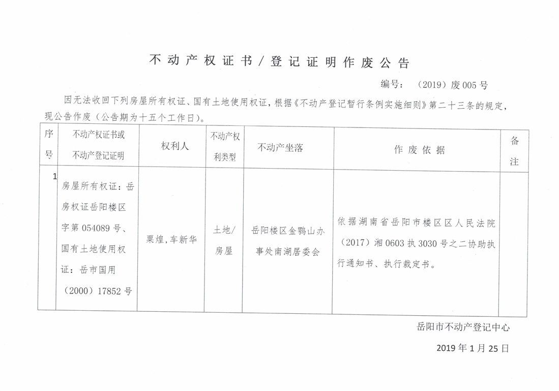 不动产权证书、登记证明作废公告 编号:(2019)废005号
