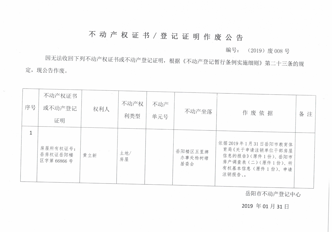 不动产权证书、登记证明作废公告 编号:(2019)废008号