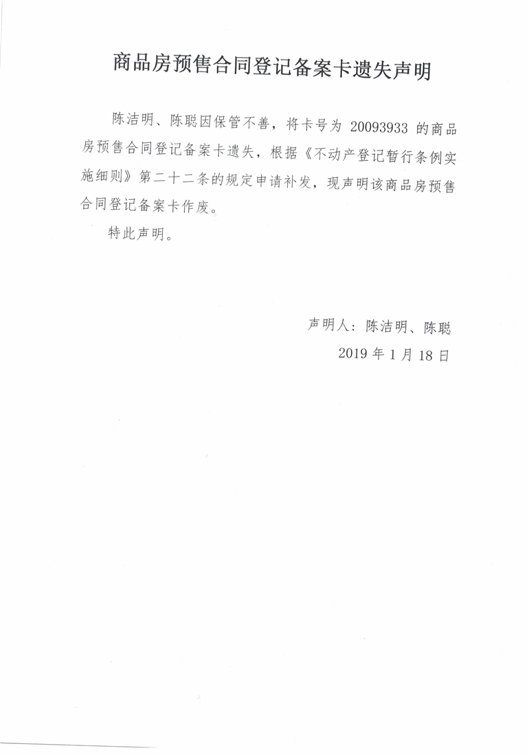 商品房预售合同登记备案卡遗失声明(陈洁明、陈聪)