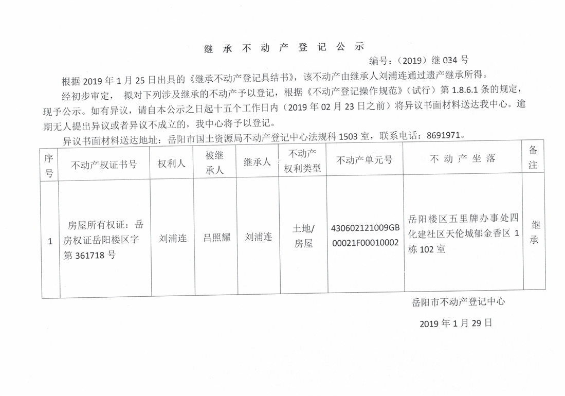 继承不动产登记公示 编号:(2019)继号034号