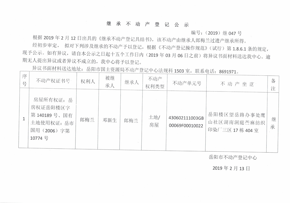 继承不动产登记公示 编号:(2019)继号047号