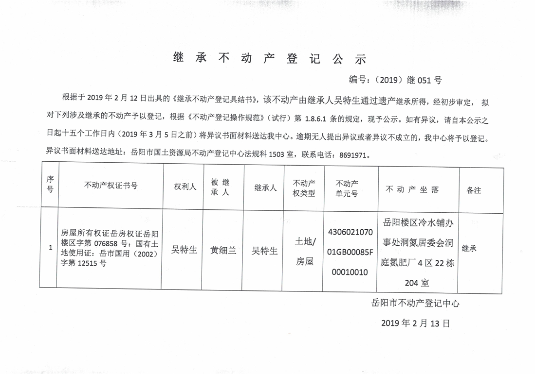 继承不动产登记公示 编号:(2019)继号051号