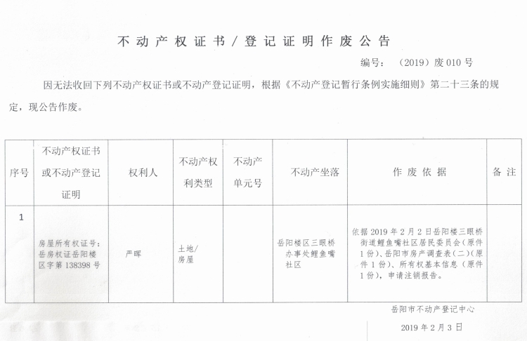 不动产权证书、登记证明作废公告 编号:(2019)废010号