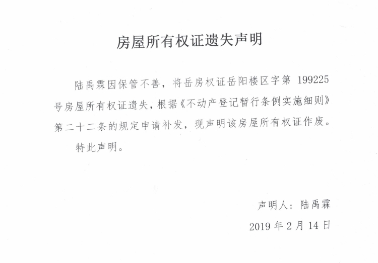 房屋所有权证遗失声明(陆禹霖)