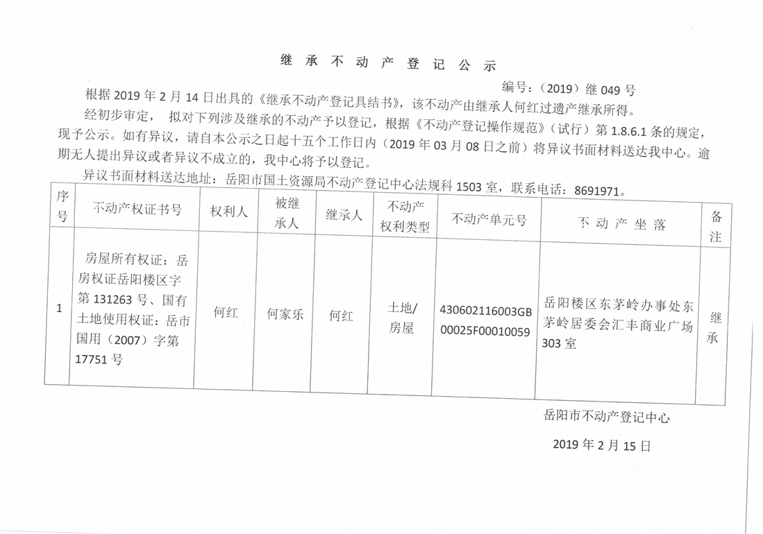 继承不动产登记公示 编号:(2019)继号049号(何红)