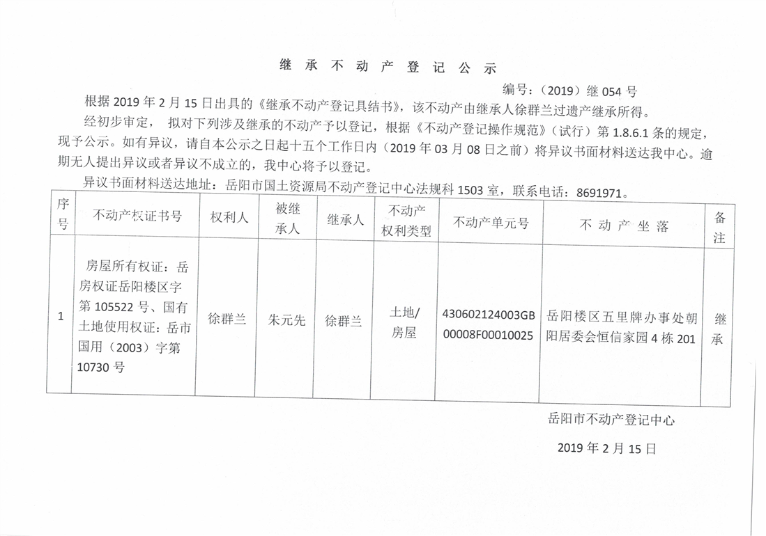 继承不动产登记公示 编号:(2019)继号054号