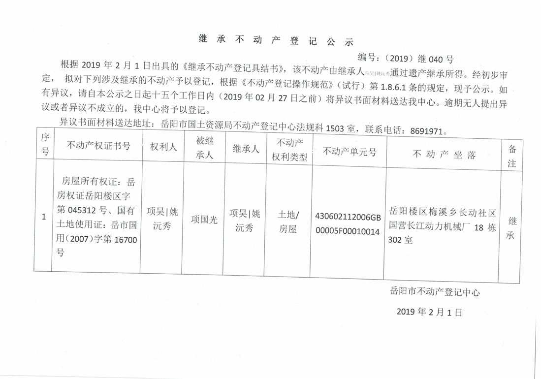 继承不动产登记公示 编号:(2019)继号040号
