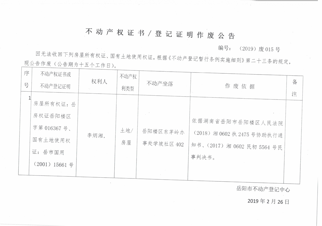 不动产权证书、登记证明作废公告 编号:(2019)废015号