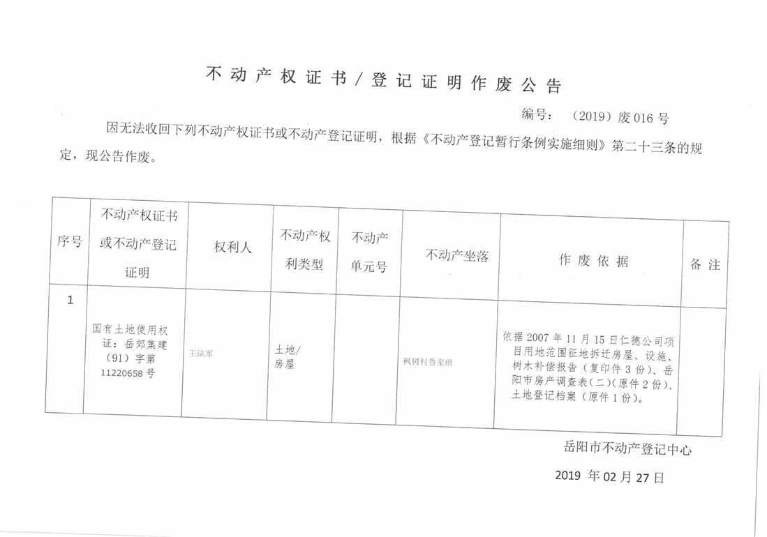 不动产权证书、登记证明作废公告 编号:(2019)废016号