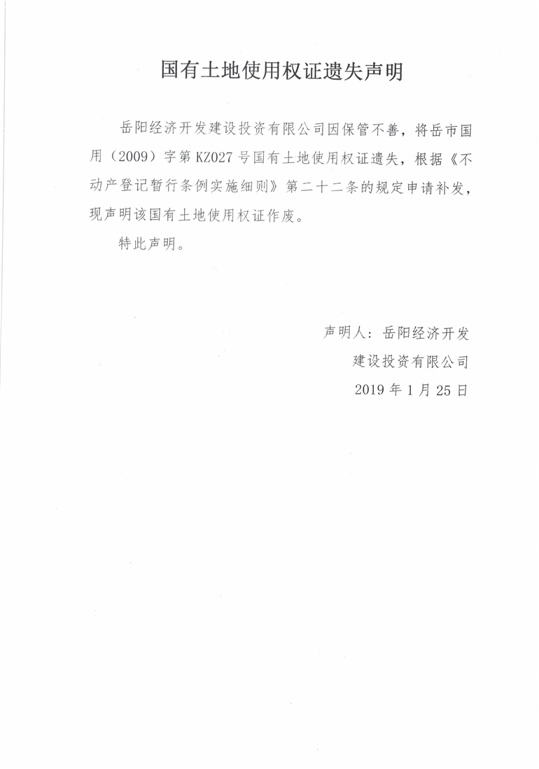 国有土地使用权证遗失声明(岳阳经济开发建设投资有限公司)