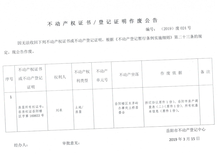 不动产权证书、登记证明作废公告 编号:(2019)废024号