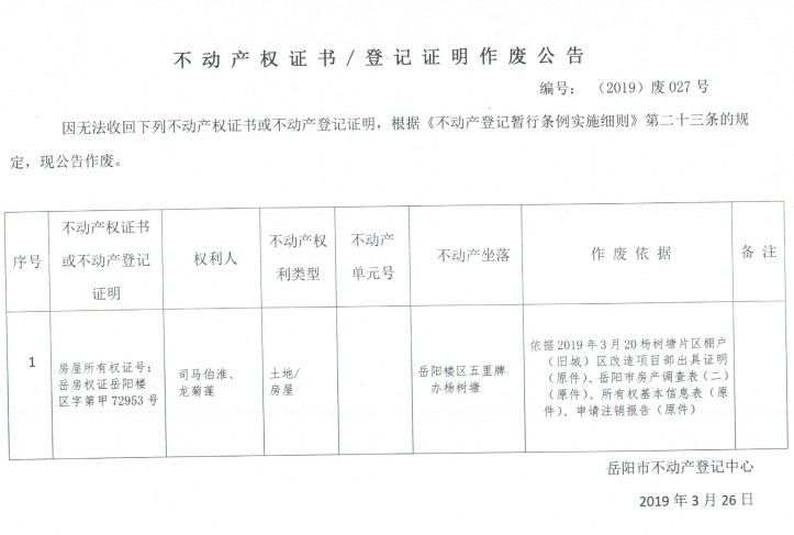 不动产权证书、登记证明作废公告 编号:(2019)废027号