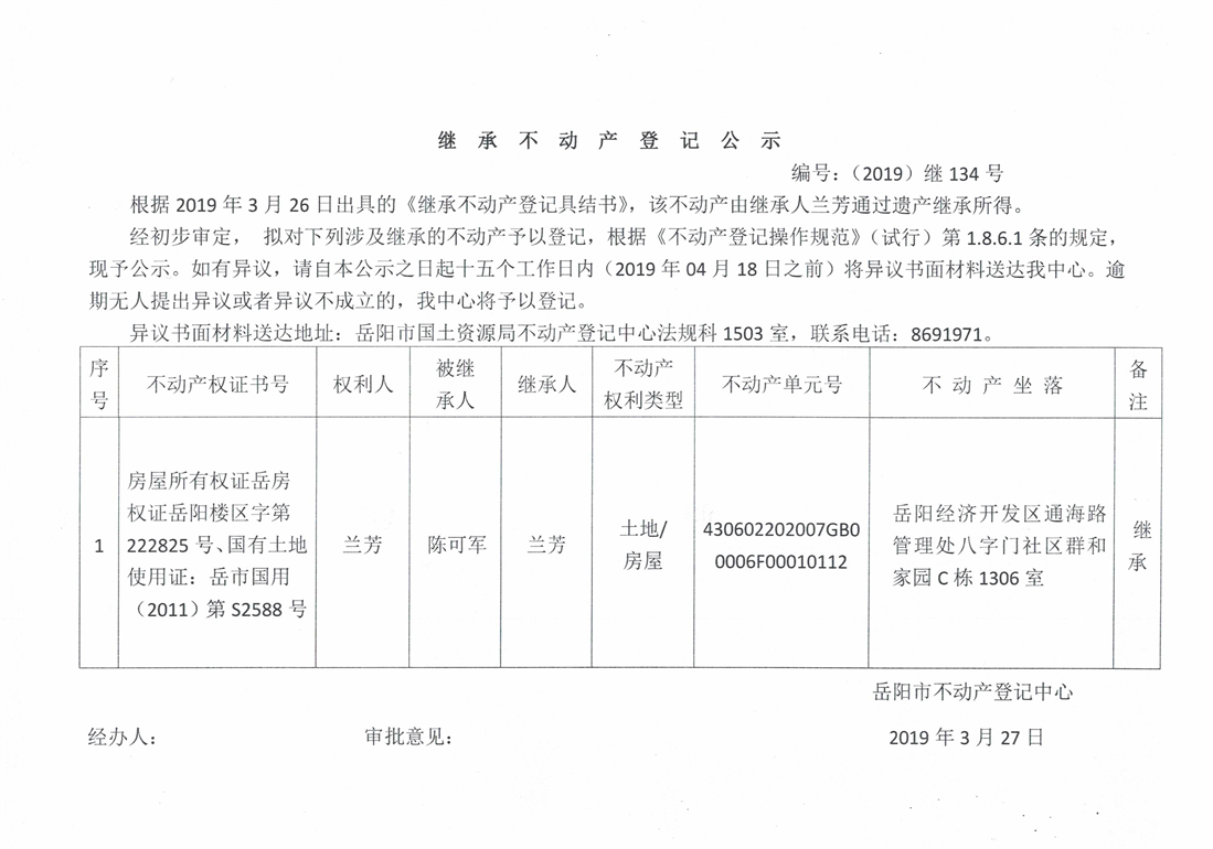 继承不动产登记公示 编号:(2019)继号134号