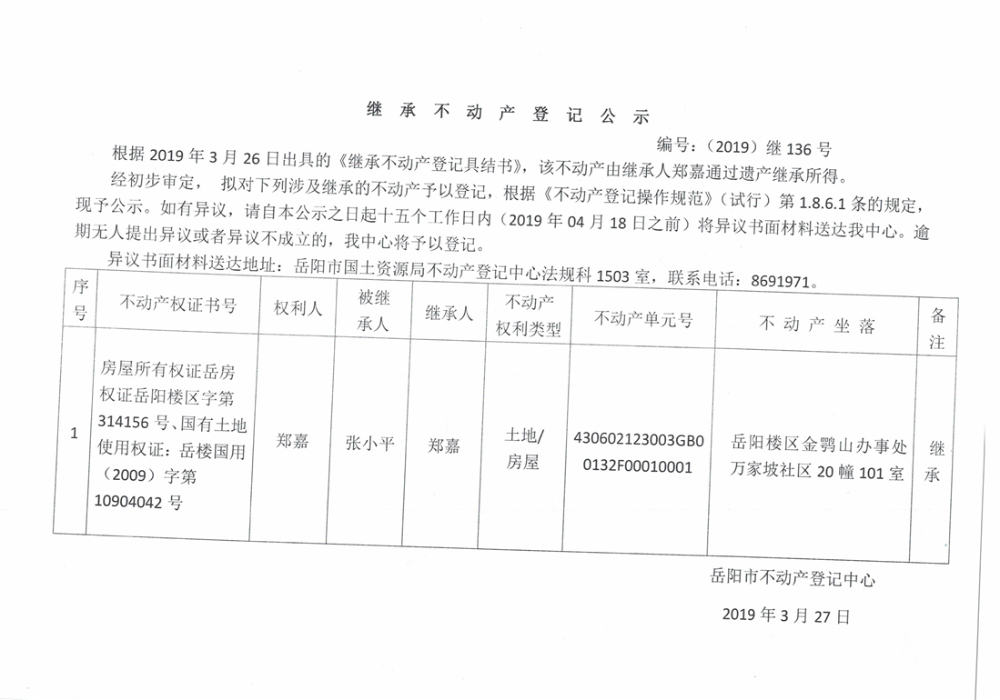 继承不动产登记公示 编号:(2019)继号136号