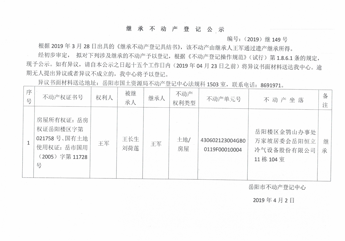 继承不动产登记公示 编号:(2019)继号149号