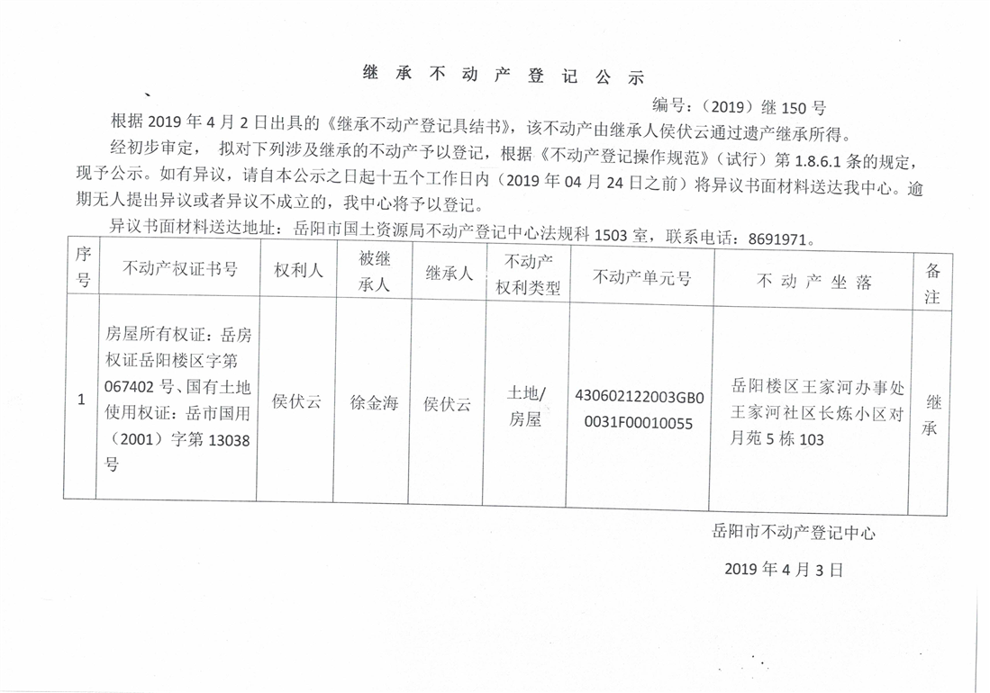 继承不动产登记公示 编号:(2019)继号150号