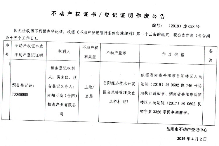 不动产权证书、登记证明作废公告 编号:(2019)废028号