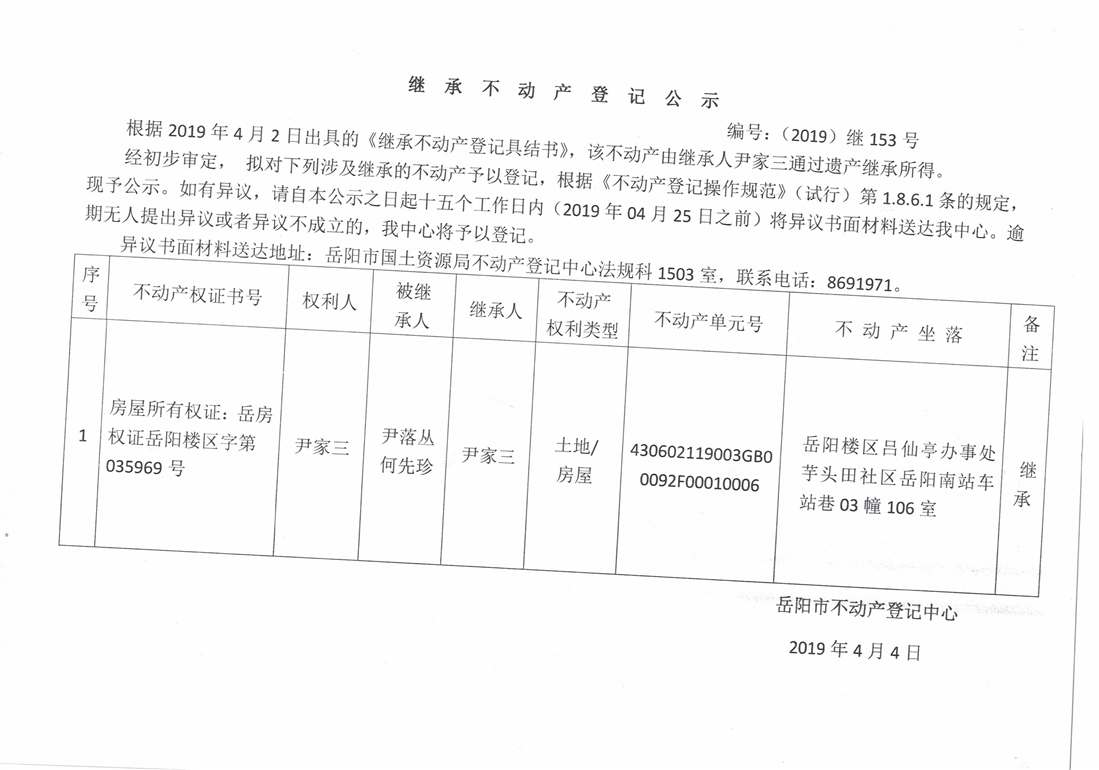 继承不动产登记公示 编号:(2019)继号153号