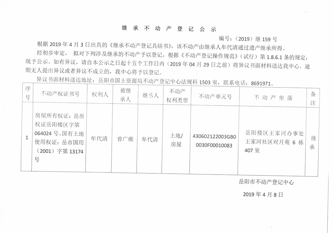 继承不动产登记公示 编号:(2019)继号159号