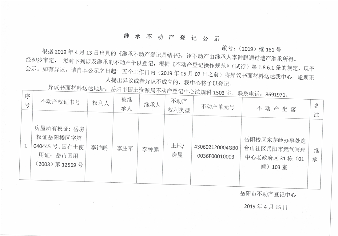 继承不动产登记公示 编号:(2019)继号181号(李钟鹏)