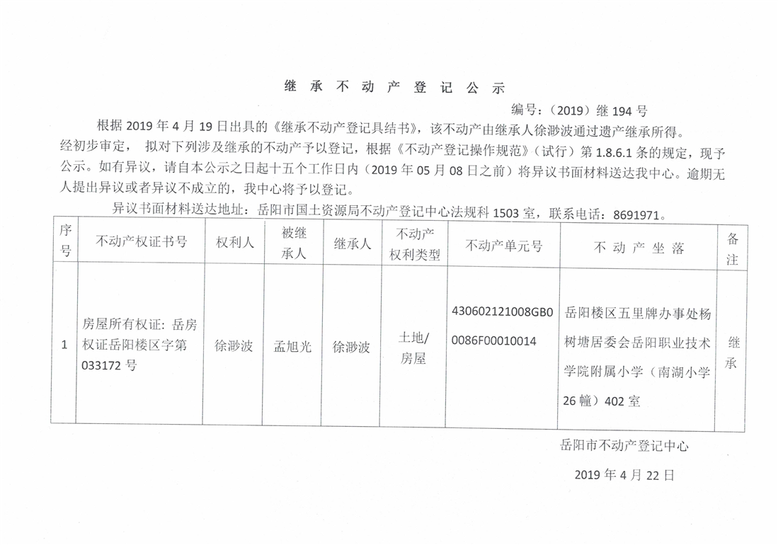 继承不动产登记公示 编号:(2019)继号194号(徐渺波)