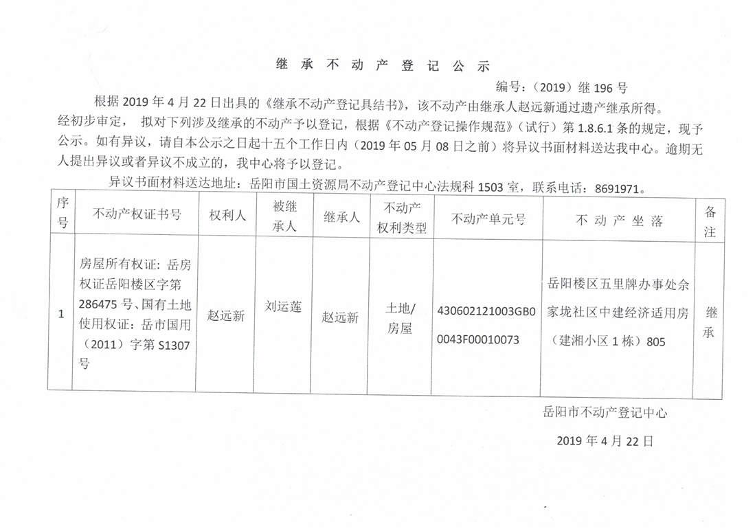 继承不动产登记公示 编号:(2019)继号196号(赵远新)