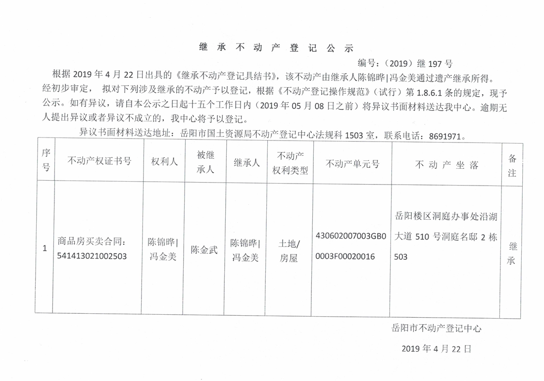 继承不动产登记公示 编号:(2019)继号197号(冯金美)