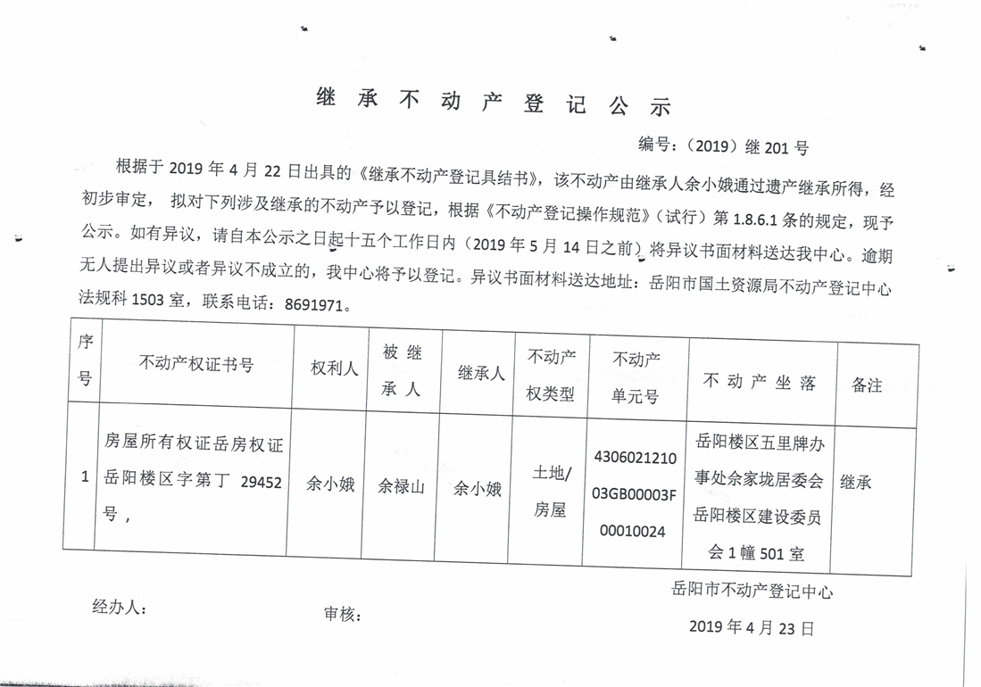 继承不动产登记公示 编号:(2019)继号201号(余小娥)
