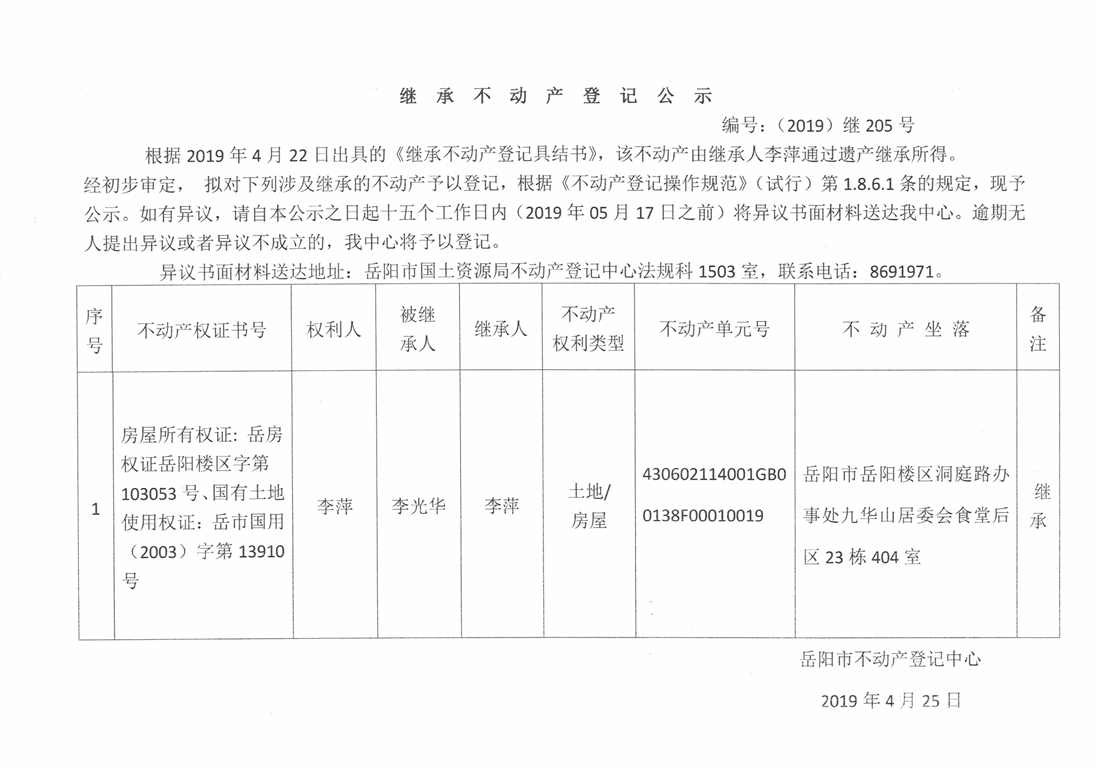继承不动产登记公示 编号:(2019)继号205号(李萍)