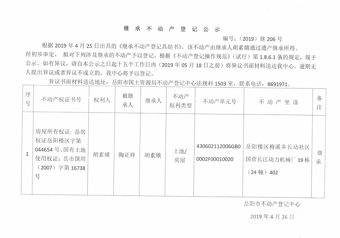 继承不动产登记公示 编号:(2019)继号206号(胡素娥)