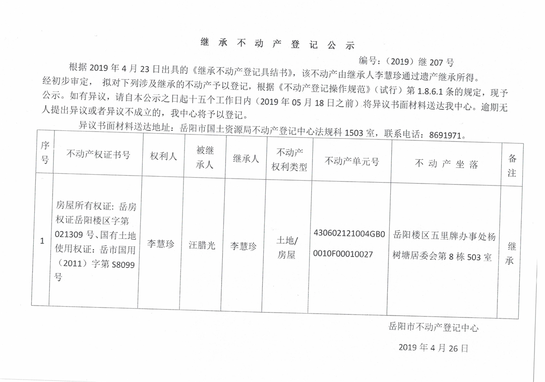 继承不动产登记公示 编号:(2019)继号207号(胡素娥)