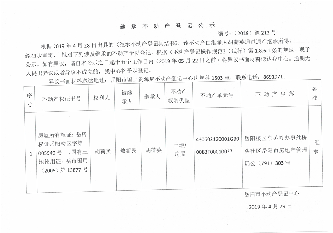 继承不动产登记公示 编号:(2019)继号212号(胡荷英)