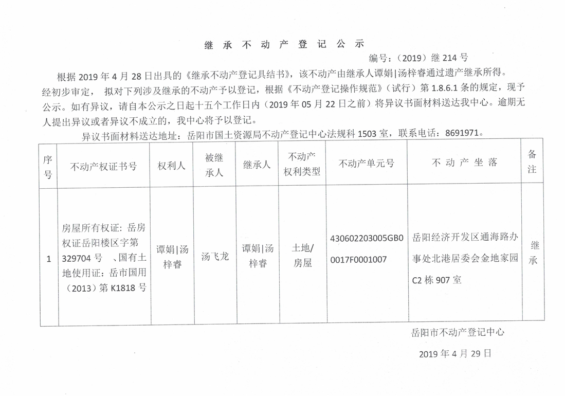 继承不动产登记公示 编号:(2019)继号214号(谭娟)