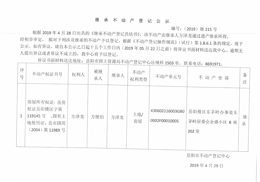 继承不动产登记公示 编号:(2019)继号215号(方泽龙)