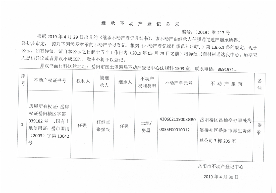 继承不动产登记公示 编号:(2019)继号217号(任强)