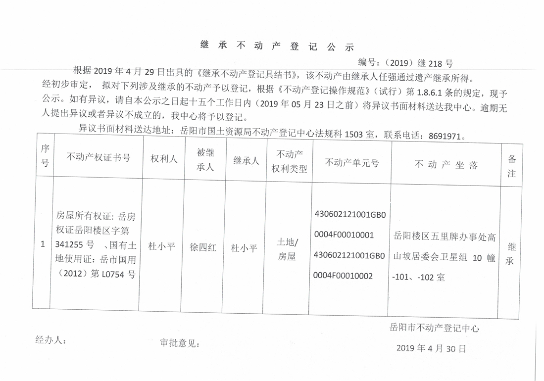 继承不动产登记公示 编号:(2019)继号218号(杜小平)