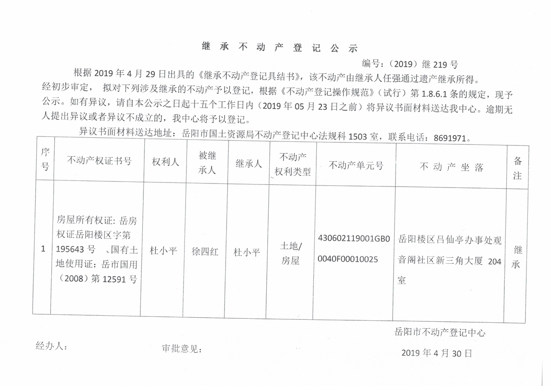 继承不动产登记公示 编号:(2019)继号219号(杜小平)