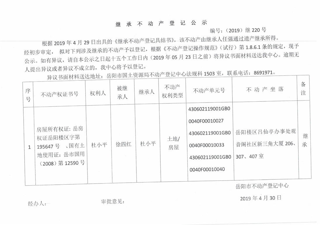 继承不动产登记公示 编号:(2019)继号220号(杜小平)