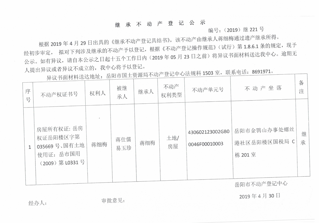 继承不动产登记公示 编号:(2019)继号221号(蒋细梅)