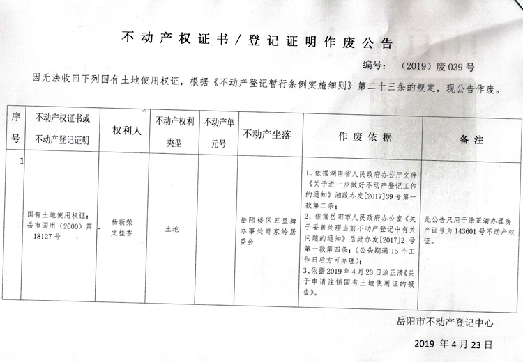 不动产权证书、登记证明作废公告 编号: (2019)废039号(杨新荣、文桂香)