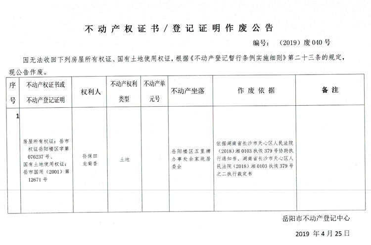 不动产权证书、登记证明作废公告 编号: (2019)废040号(孙保田、龙菊香)