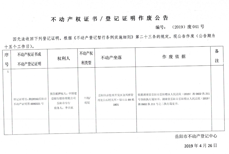 不动产权证书、登记证明作废公告 编号: (2019)废041号(抵押权人:中国建设银行股份有限公司岳阳市分行)